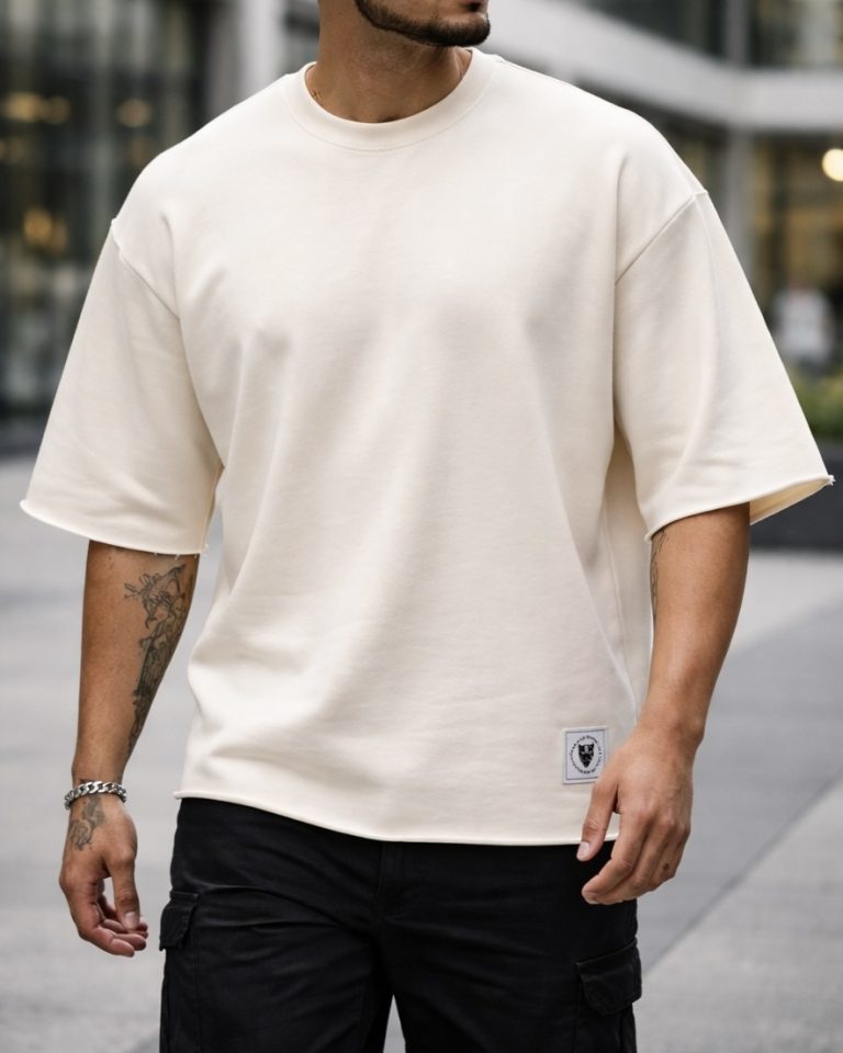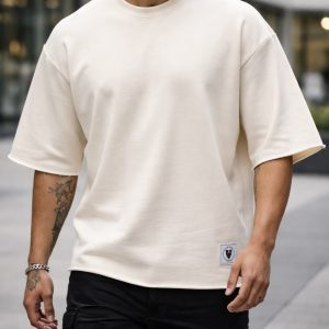Oversized beige T-shirt featuring a minimal design with raw edge details on the sleeves and hem for a modern streetwear look. The loose fit creates a relaxed yet strong visual presence.