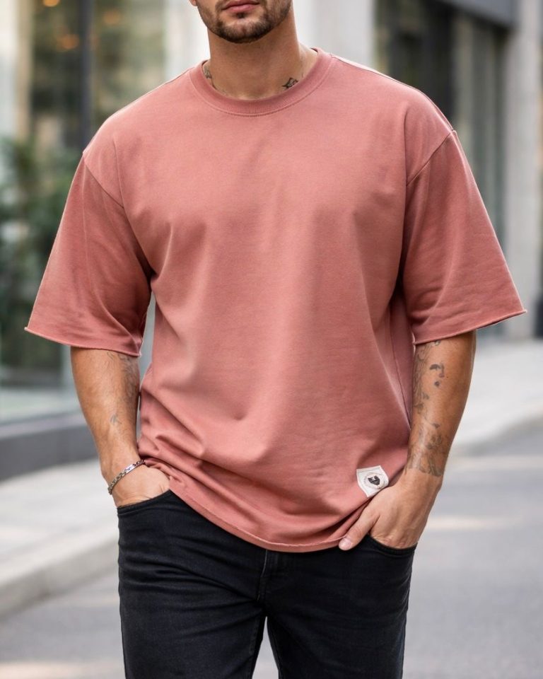 Oversized Dusty Coral T-shirt with raw edge details, offering a warm and modern streetwear look.