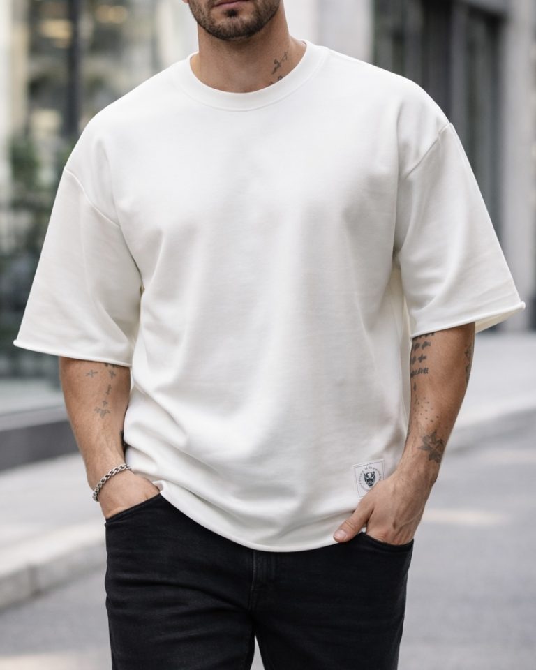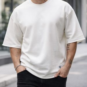 Maicë oversized në ngjyrë off white me dizajn minimalist dhe detaje raw që i japin një pamje moderne dhe clean. Forma e lirshme krijon një stil të relaksuar dhe premium.