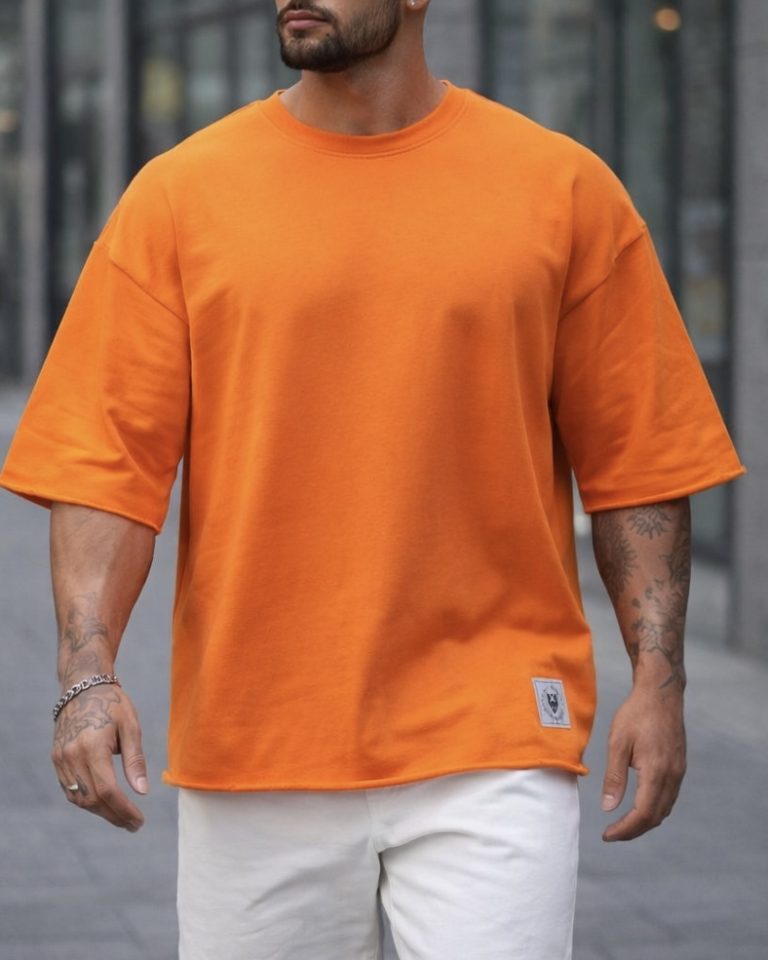 Oversized orange T-shirt featuring a minimal design with raw edge details on the sleeves and hem for a bold streetwear look. The loose fit creates a relaxed yet strong visual presence.