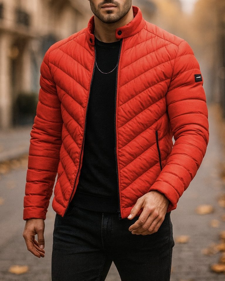 A bold quilted jacket designed to stand out. Warm, lightweight, and stylish with its diagonal stitching. Perfect for those who want a strong and modern winter look.