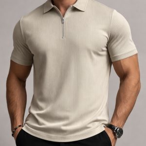 Polo moderne me teksturë ribbed dhe zinxhir në pjesën e jakës, e dizajnuar për një pamje elegante dhe minimaliste. Materiali elastik dhe shumë i butë përshtatet natyrshëm me trupin duke krijuar një siluetë të pastër dhe mashkullore. Ngjyra beige e bën këtë polo shumë të lehtë për kombinime verore dhe smart-casual.