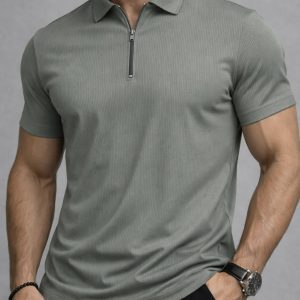 Sage green ribbed polo designed with a modern zip collar and soft stretch fabric. The clean silhouette and subtle texture create a contemporary look that works perfectly for everyday outfits.