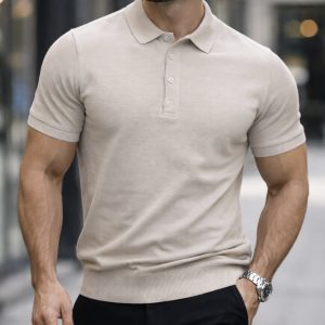 A premium beige polo with a warm tone, crafted from a soft and refined knit fabric that delivers a clean and sophisticated look. The minimalist design with a classic collar and ribbed finishes makes it perfect for modern and versatile styling.