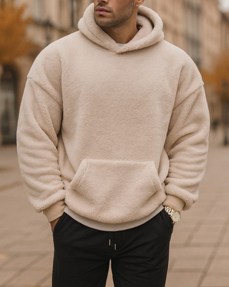 A clean and minimal beige sherpa hoodie. Soft texture and a warm, relaxed fit for everyday comfort.