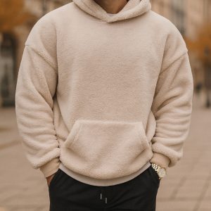 Hoodie sherpa minimal në ngjyrë bezhë. Shumë i butë, i ngrohtë dhe i rehatshem për veshje të përditshme.