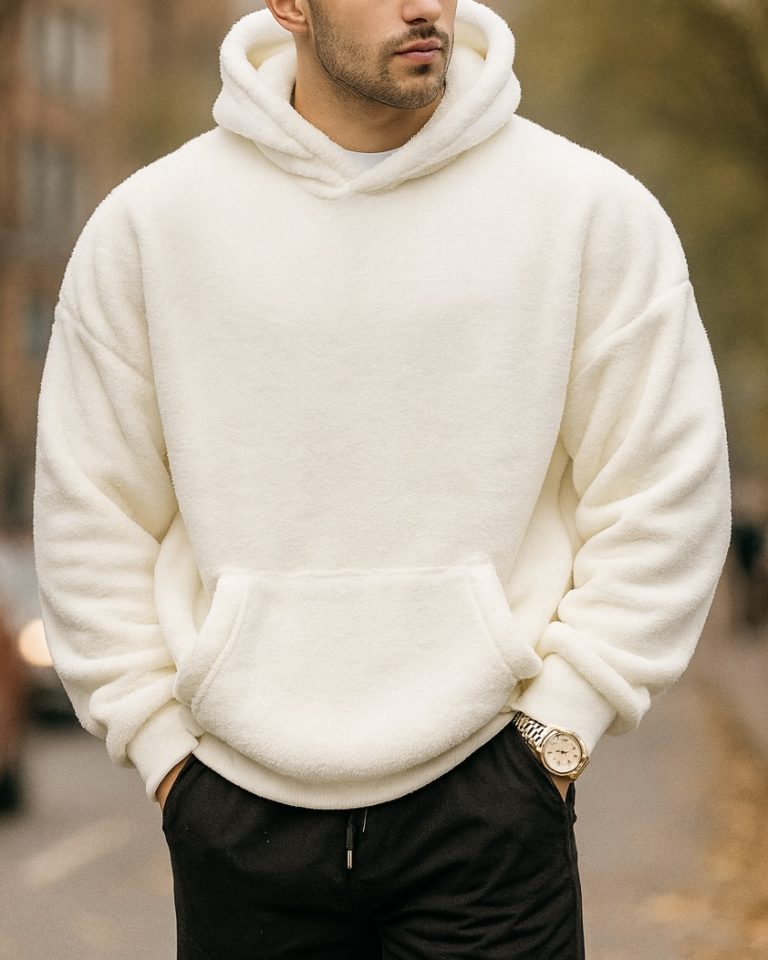 Hoodie sherpa në të bardhë qumështi – shumë i butë, i ngrohtë dhe estetik për dimër.
