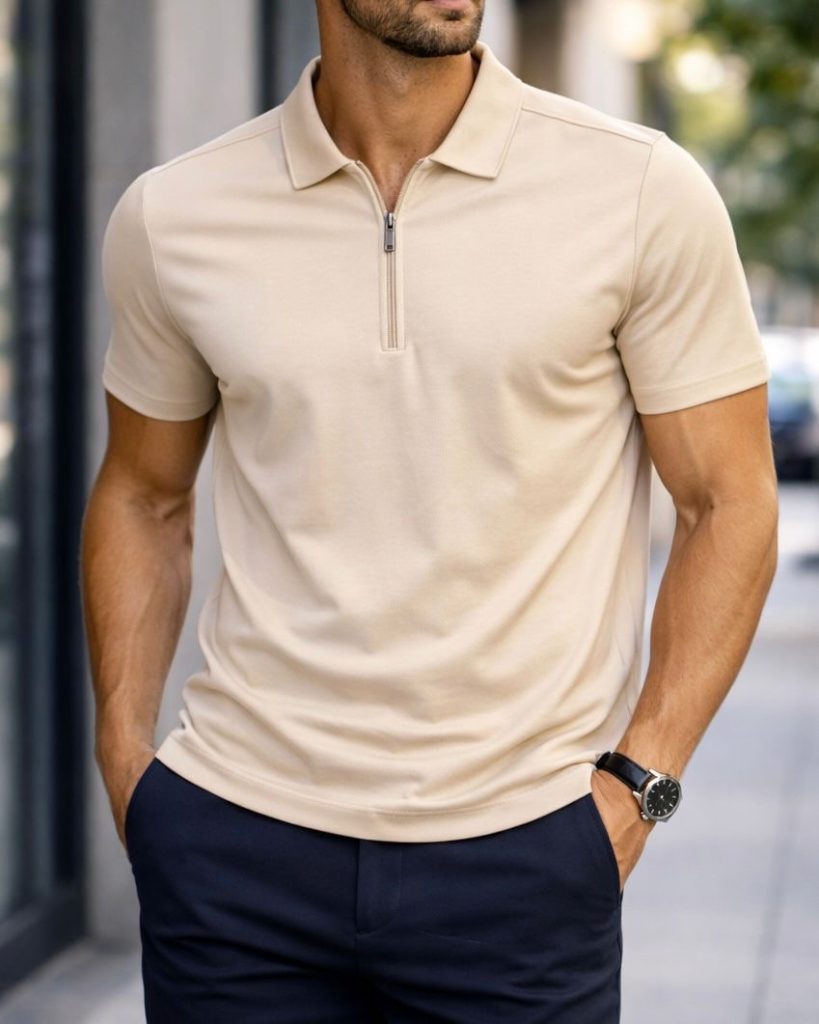 Slim Zip Polo Shirt – Beige