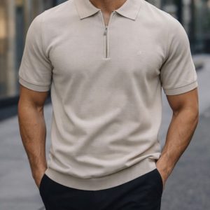 Polo me zinxhir në ngjyrë beige me teksturë të lehtë knit që krijon një pamje të pastër dhe elegante. Dizajni minimalist me jakë klasike dhe zip i jep një stil modern dhe premium, ideal për kombinime smart casual.