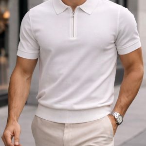 Polo me zinxhir në ngjyrë të bardhë me teksturë knit që krijon një pamje shumë të pastër dhe elegante. Dizajni minimalist me jakë klasike dhe zip i jep një stil modern dhe premium, perfekt për kombinime smart casual dhe verore.