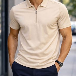 Beige zip polo shirt with a modern minimal design that delivers a clean and refined look. The zip-up collar adds a contemporary touch, making it perfect for smart casual outfits.