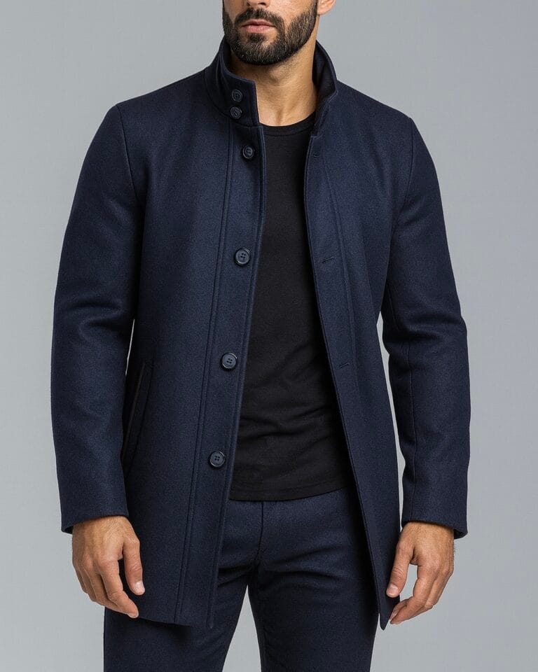 A refined wool-blend coat with a structured silhouette, designed for modern sophistication and timeless appeal. Features a high stand collar and tonal button closure for a clean, tailored finish.