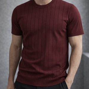 Refined textured knit T-shirt featuring a minimal vertical structure. The deep wine tone delivers a sophisticated, modern and premium aesthetic.
