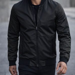 Modern black bomber jacket featuring a clean, minimalist urban design. The smooth fabric and structured silhouette create a sharp, versatile piece designed for effortless everyday wear.