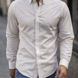 White shirt with subtle light beige pinstripes, designed for a clean, refined, and modern look. The soft neutral tones create a premium aesthetic that’s easy to style for urban outfits, office wear, or smart-casual occasions. Crafted from a comfortable fabric that maintains its shape throughout the day.