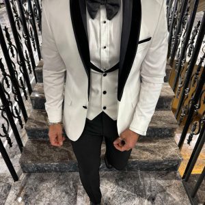 Smoking i bardhë me jakë sateni të zi — një pamje që bie në sy me stil dhe klas. Punim luksoz, formë moderne dhe komoditet i jashtëzakonshëm. Zgjedhja ideale për dhëndurë, fejesa dhe evente të nivelit të lartë.