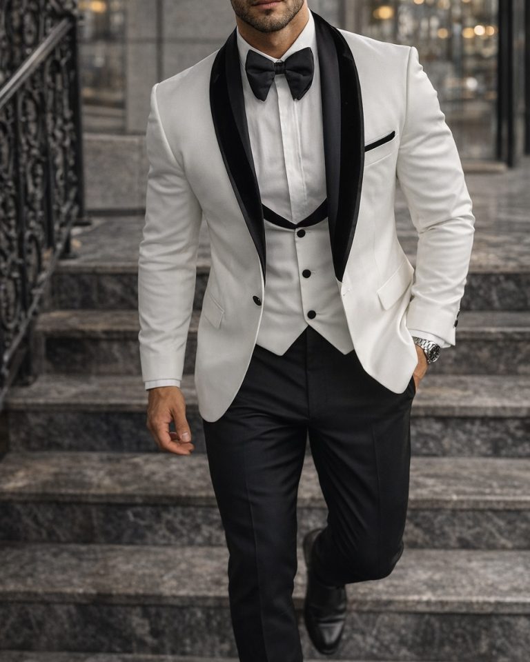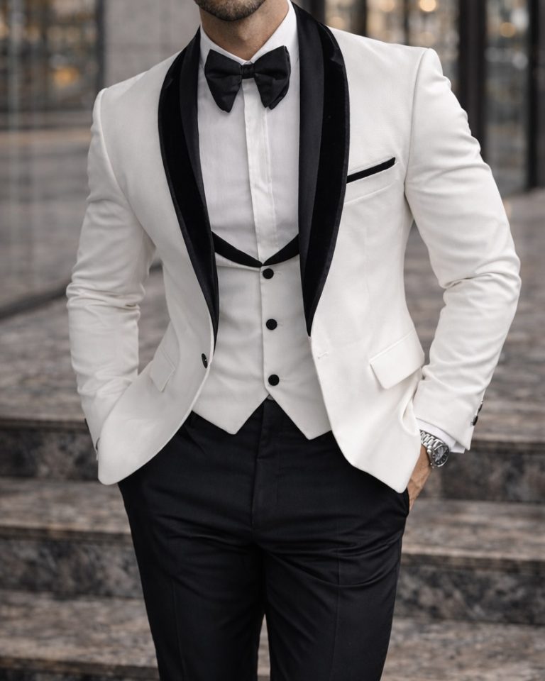 A striking white tuxedo with contrasting black satin lapels. Designed for men who want to stand out with class. Luxurious craftsmanship, modern fit, and exceptional comfort — the perfect choice for weddings, engagements, and high-end events.