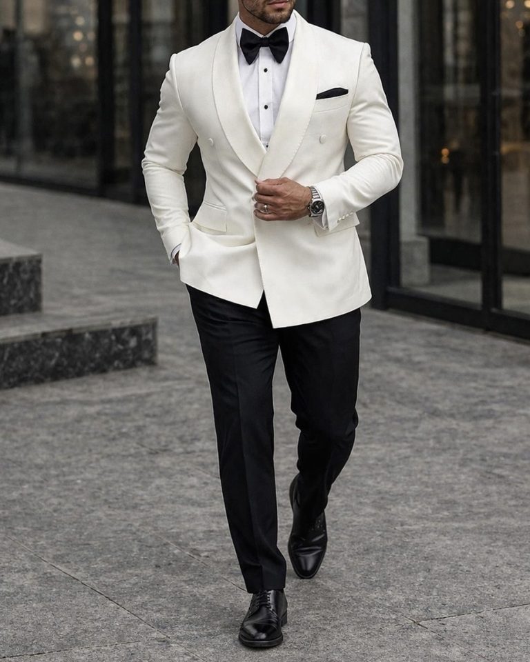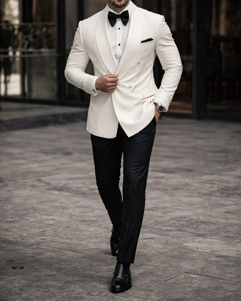 A refined white tuxedo designed for the modern gentleman. Tailored in a double-breasted cut with satin shawl lapels, this piece delivers a clean, sophisticated, and timeless look. Perfect for weddings, galas, and all formal evening events.