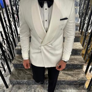 Smoking i bardhë i dizajnuar për xhentëlmenin modern. Me prerje double-breasted dhe jakë satin të rrumbullakët, ofron një pamje të pastër, të sofistikuar dhe të përjetshme. Zgjedhja perfekte për dasma, gala dhe çdo event formal mbrëmjeje.