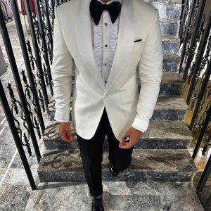 A luxurious white tuxedo set designed to stand out with clean sophistication. Featuring a premium white satin lapel, a modern slim-fit silhouette, and a sharp black-and-white contrast. The set includes the white jacket, black trousers, and matching bow tie – perfect for weddings, VIP events, galas, and black-tie occasions.