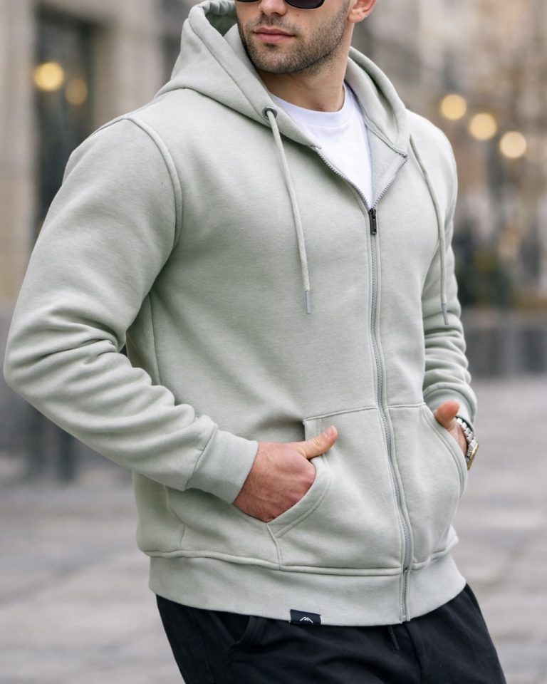 A modern zip-up hoodie with a relaxed urban aesthetic. The sage green color brings a fresh and contemporary feel to casual streetwear looks.