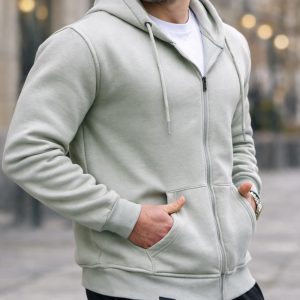 Hoodie me zinxhir me dizajn modern urban dhe ngjyrë sage green që sjell freski dhe stil bashkëkohor.