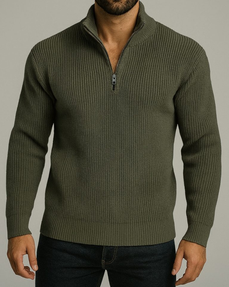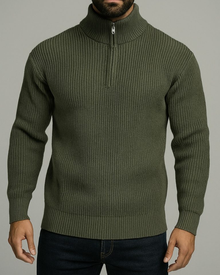 HALF-ZIP RIBBED KNIT SWEATER – OLIVE GREEN