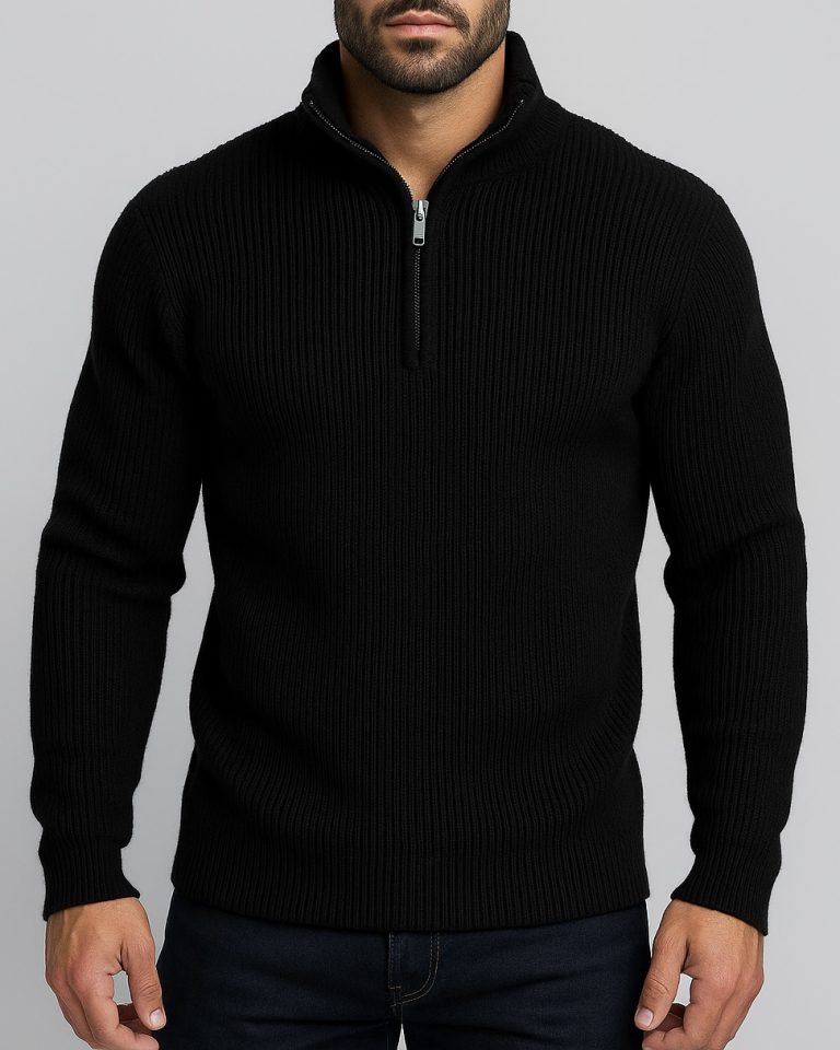 HALF-ZIP RIBBED KNIT SWEATER – BLACK